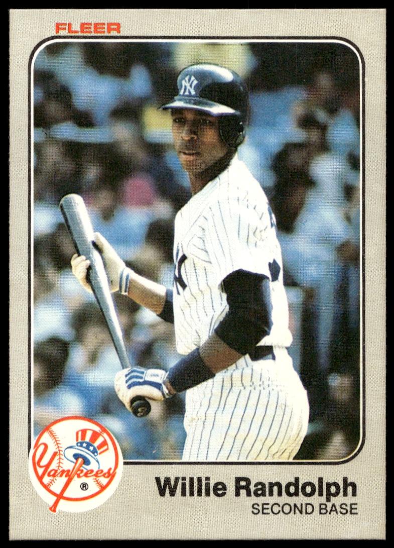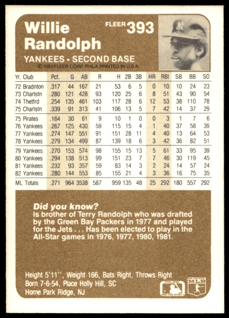 This Baseball card, from 1983 is part of the Fleer  card set. Willie Randolph is featured and has a card number of 393.