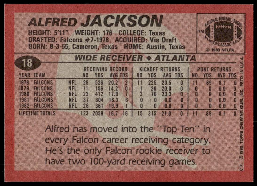 This Football card, from 1983 is part of the Topps card set. Alfred Jackson is featured and has a card number of 18.