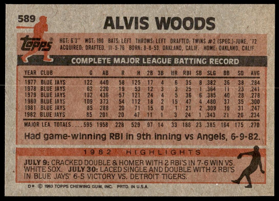 This Baseball card, from 1983 is part of the Topps  card set. Alvis Woods is featured and has a card number of 589.