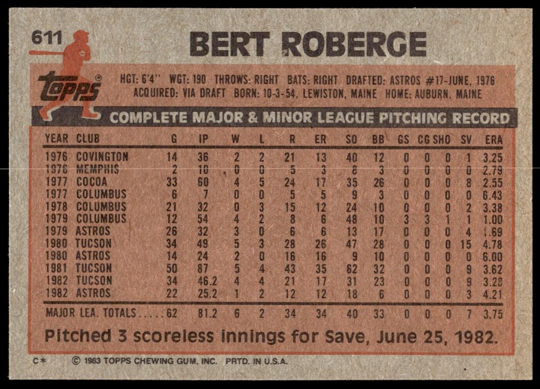 This Baseball card, from 1983 is part of the Topps  card set. Bert Roberge is featured and has a card number of 611.