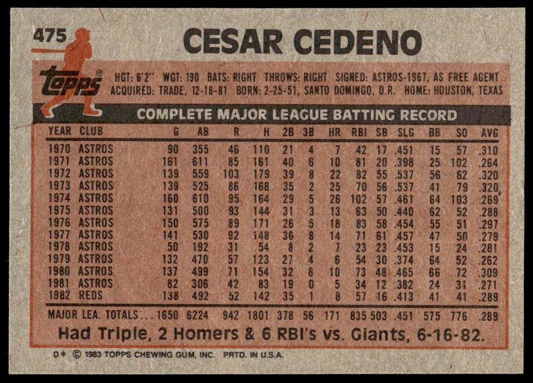This Baseball card, from 1983 is part of the Topps  card set. Cesar Cedeno is featured and has a card number of 475.