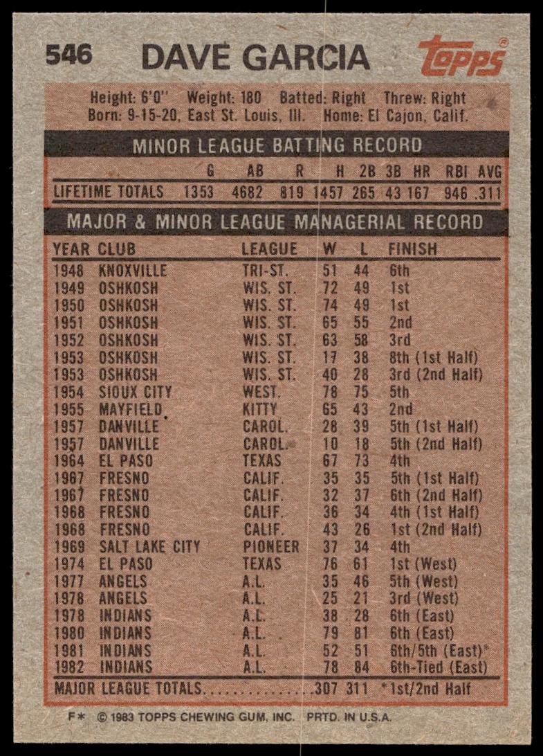 This Baseball card, from 1983 is part of the Topps  card set. Dave Garcia is featured and has a card number of 546.