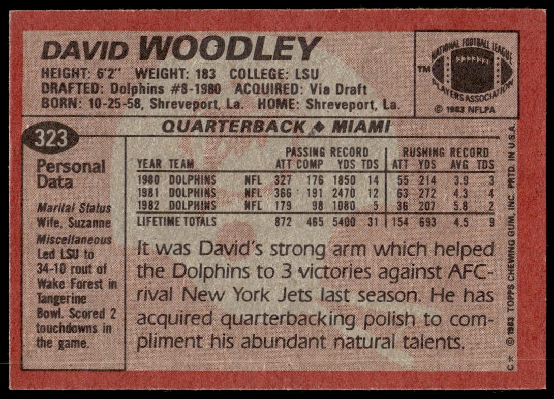 This Football card, from 1983 is part of the Topps card set. David Woodley is featured and has a card number of 323.