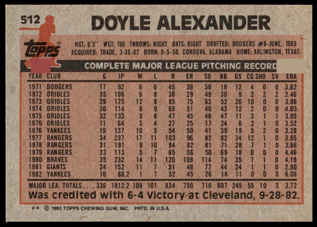 This Baseball card, from 1983 is part of the Topps card set. Doyle Alexander is featured and has a card number of 512.