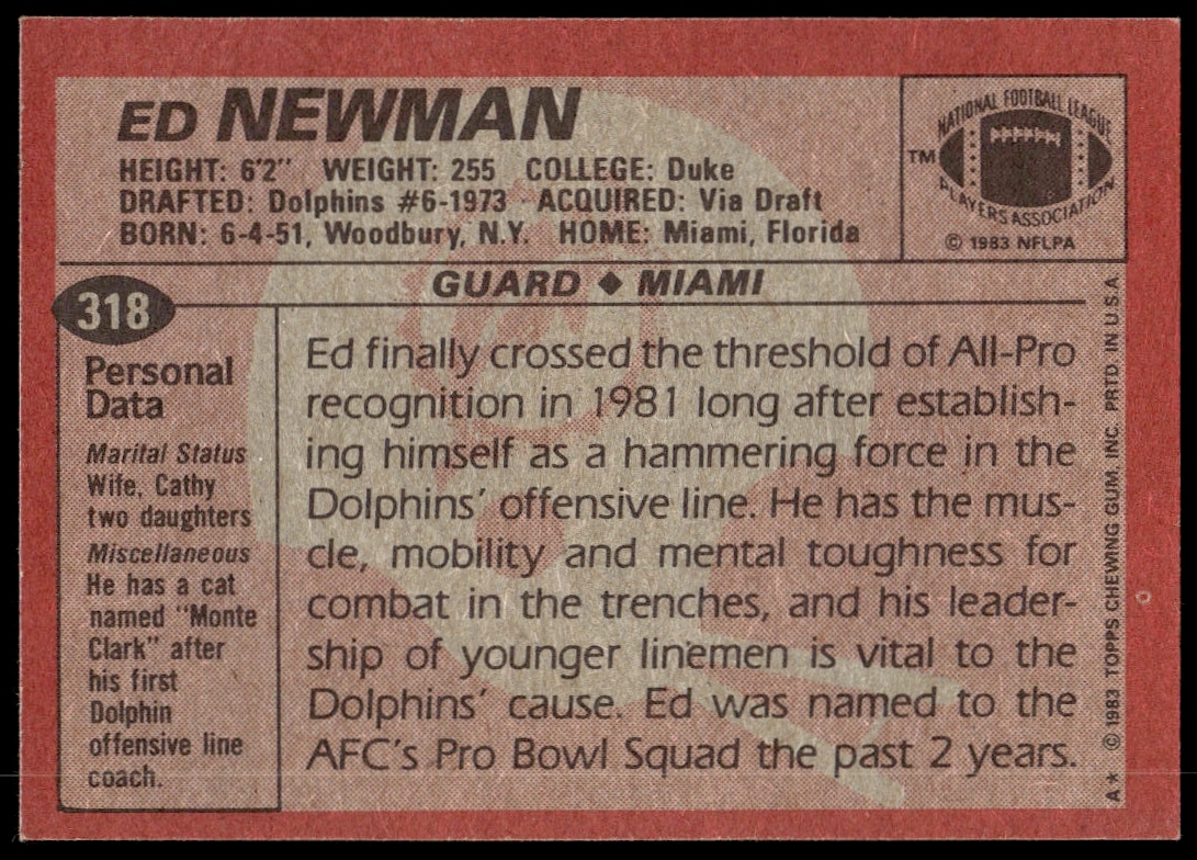 This Football card, from 1983 is part of the Topps card set. Ed Newman is featured and has a card number of 318.