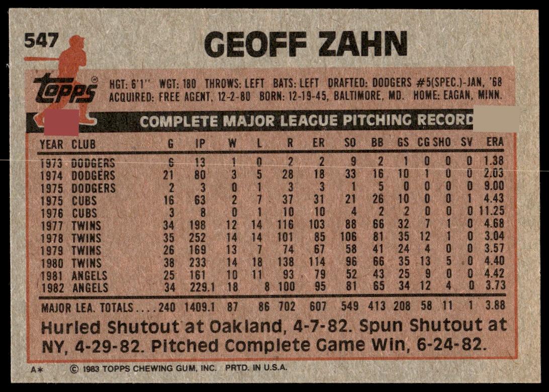 This Baseball card, from 1983 is part of the Topps  card set. Geoff Zahn is featured and has a card number of 547.