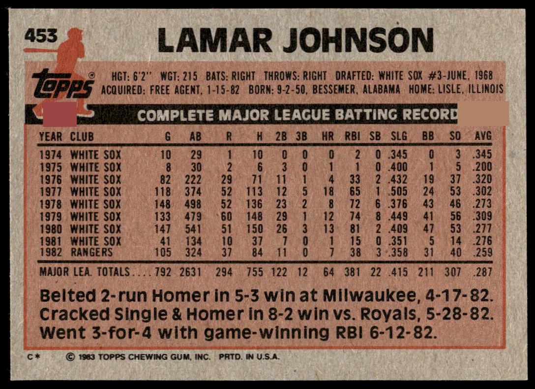 This Baseball card, from 1983 is part of the Topps  card set. Lamar Johnson is featured and has a card number of 453.