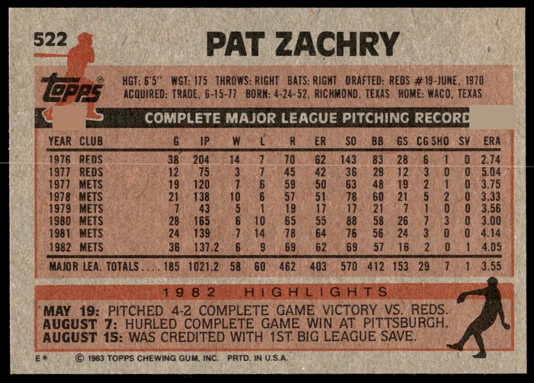 This Baseball card, from 1983 is part of the Topps  card set. Pat Zachry is featured and has a card number of 522.
