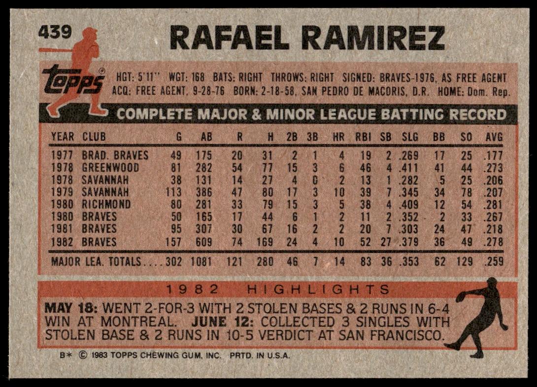 This Baseball card, from 1983 is part of the Topps  card set. Rafael Ramirez is featured and has a card number of 439.