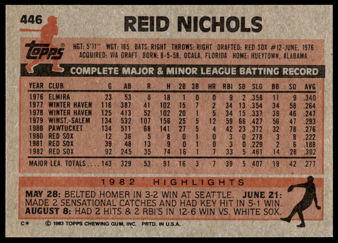 This Baseball card, from 1983 is part of the Topps  card set. Reid Nichols is featured and has a card number of 446.