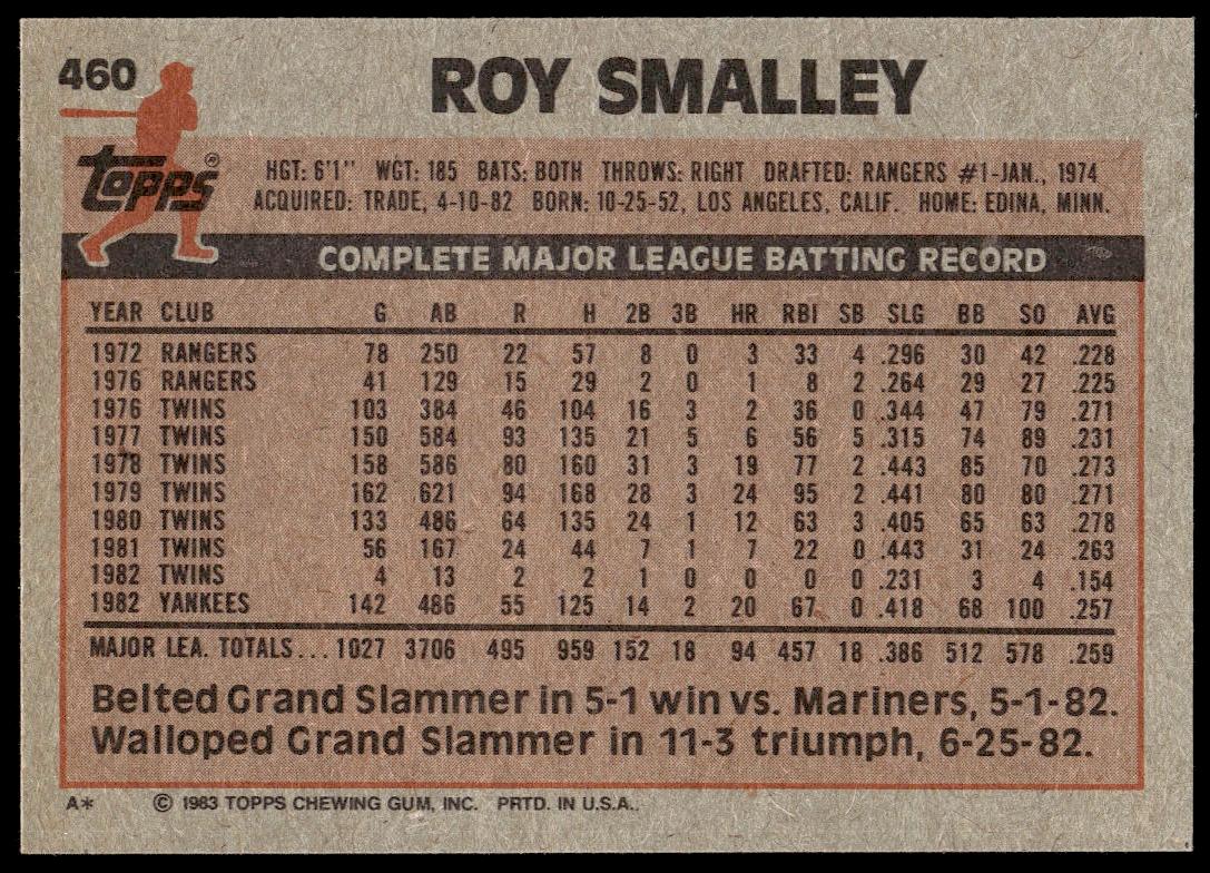 This Baseball card, from 1983 is part of the Topps  card set. Roy Smalley is featured and has a card number of 460.