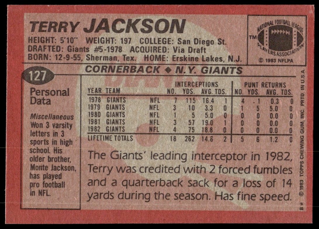 This Football card, from 1983 is part of the Topps card set. Terry Jackson is featured and has a card number of 127.