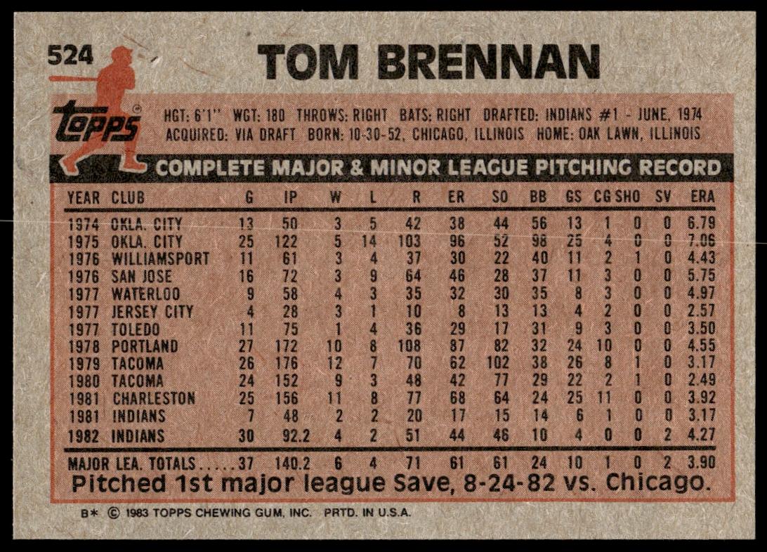 This Baseball card, from 1983 is part of the Topps  card set. Tom Brennan is featured and has a card number of 524.
