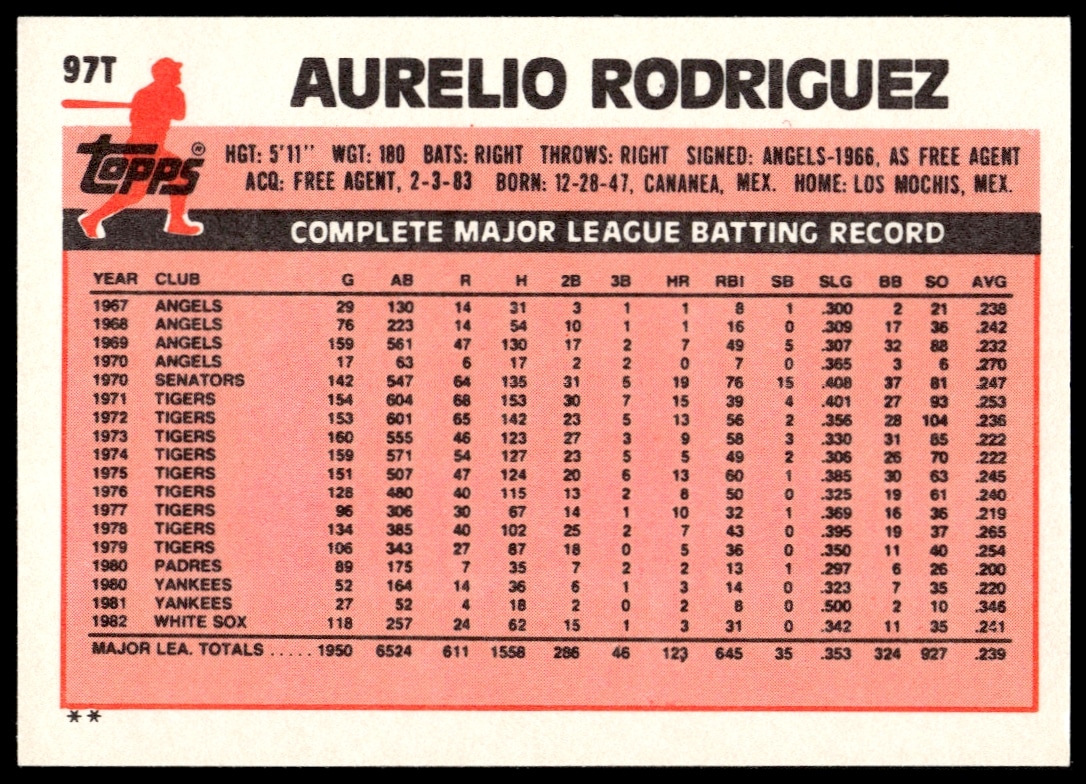 This Baseball card, from 1983 is part of the Topps Traded card set. Aurelio Rodriguez is featured and has a card number of 97T.