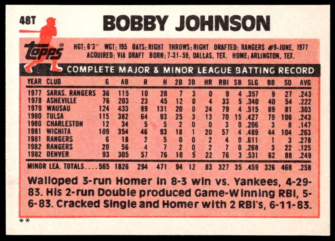 This Baseball card, from 1983 is part of the Topps Traded card set. Bobby Johnson is featured and has a card number of 48T.
