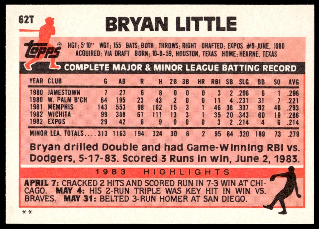 This Baseball card, from 1983 is part of the Topps Traded card set. Bryan Little is featured and has a card number of 62T.