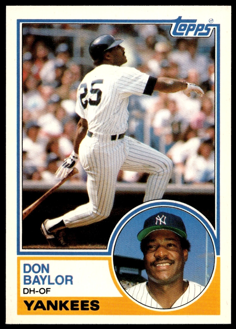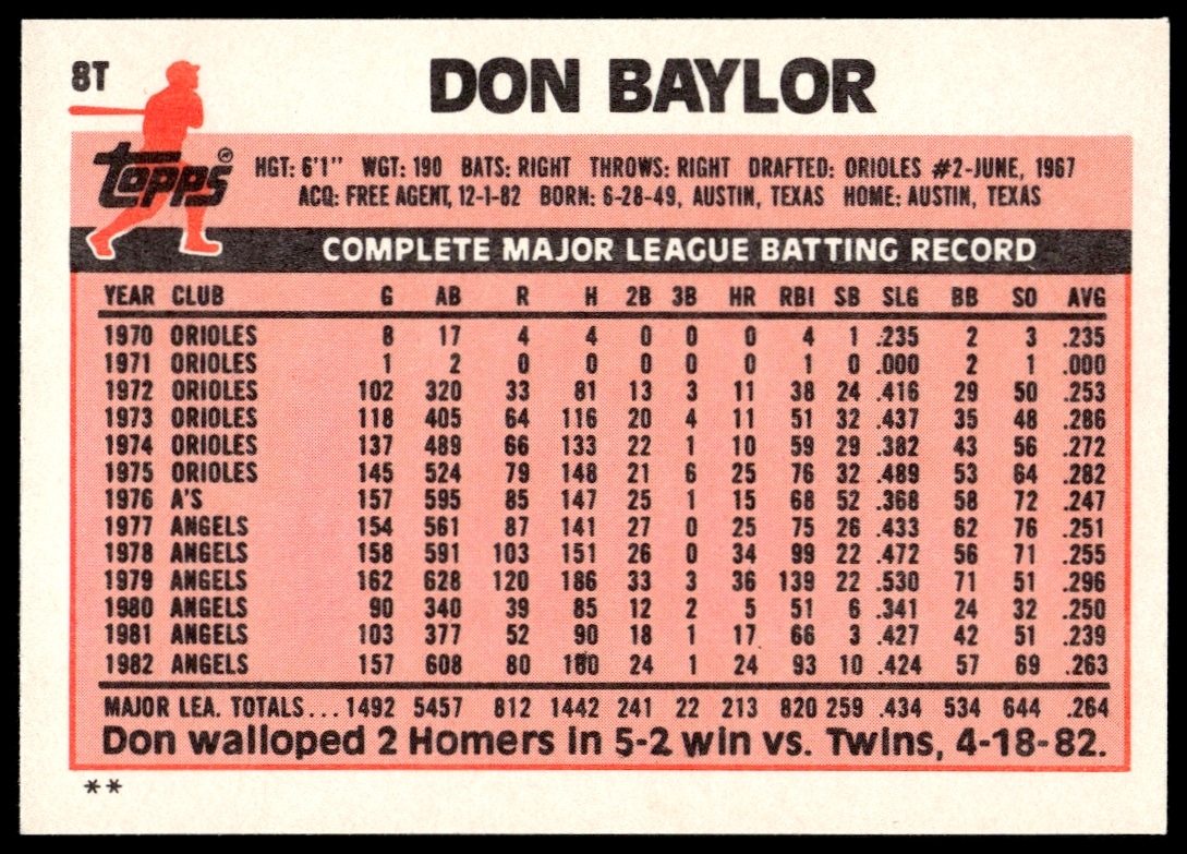 This Baseball card, from 1983 is part of the Topps Traded card set. Don Baylor is featured and has a card number of 8T.