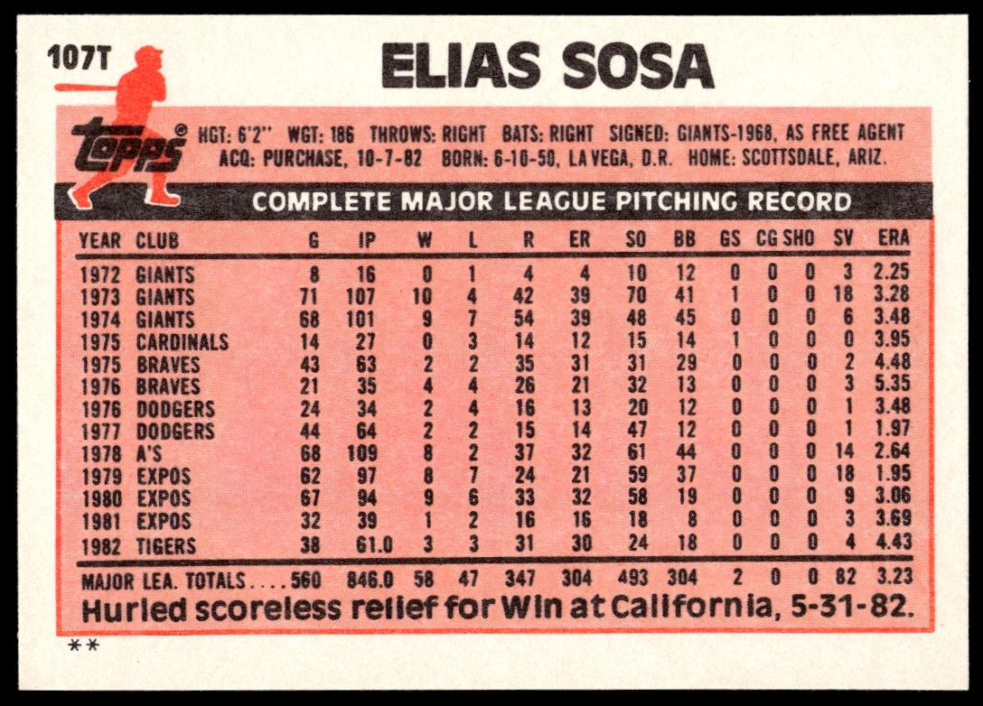 This Baseball card, from 1983 is part of the Topps Traded card set. Elias Sosa is featured and has a card number of 107T.