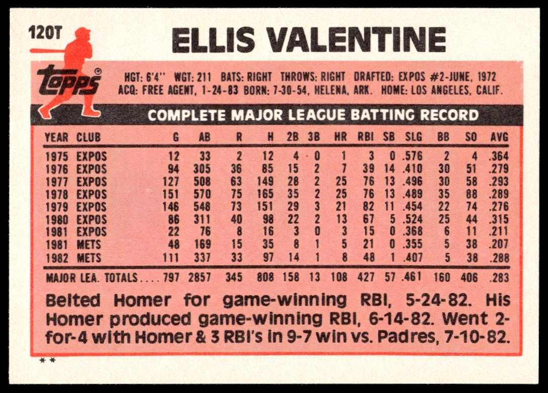 This Baseball card, from 1983 is part of the Topps Traded card set. Ellis Valentine is featured and has a card number of 120T.