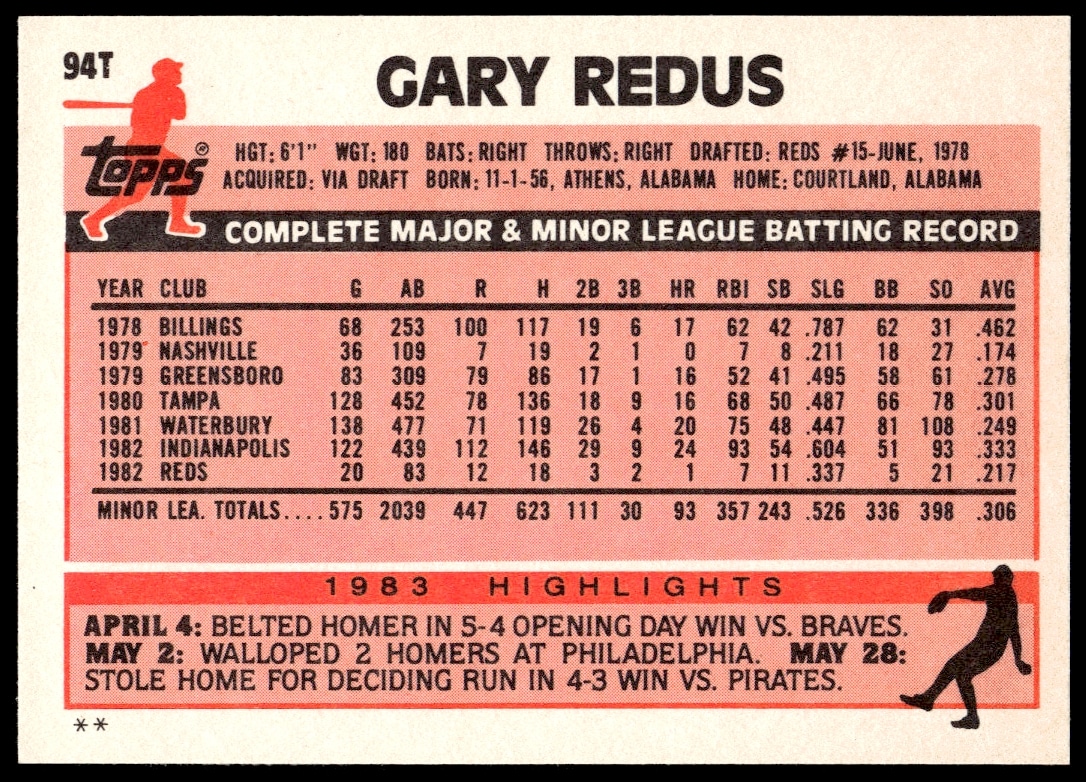 This Baseball card, from 1983 is part of the Topps Traded card set. Gary Redus is featured and has a card number of 94T.