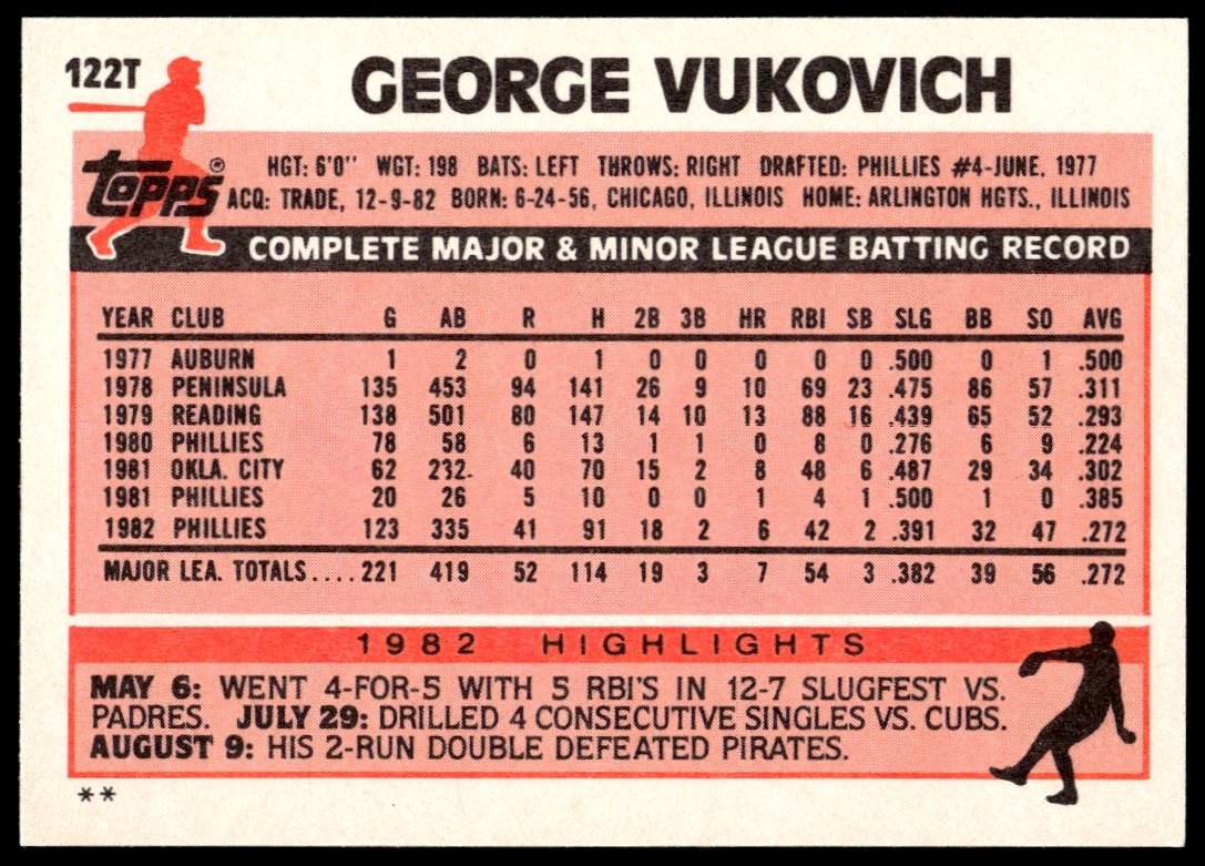 This Baseball card, from 1983 is part of the Topps Traded card set. George Vukovich is featured and has a card number of 122T.
