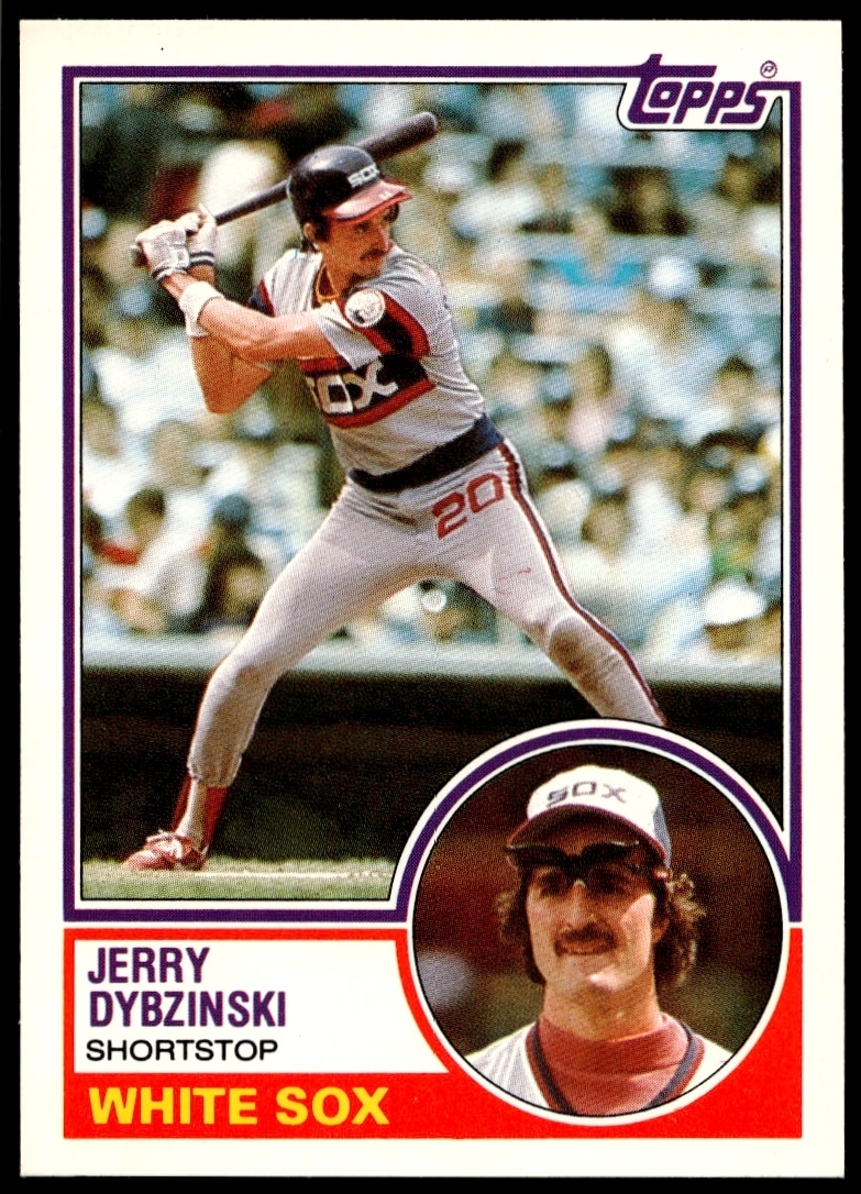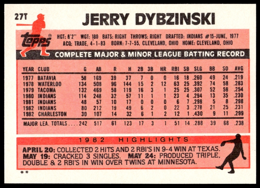This Baseball card, from 1983 is part of the Topps Traded card set. Jerry Dybzinski is featured and has a card number of 27T.