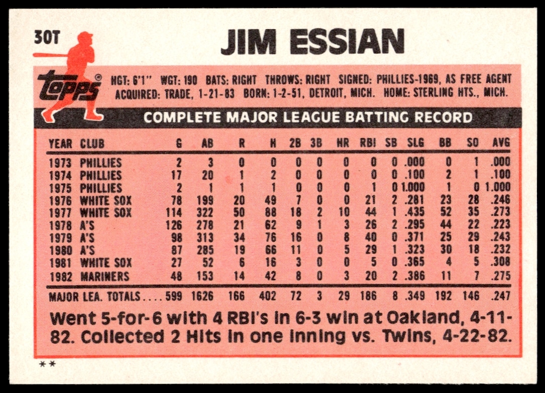 This Baseball card, from 1983 is part of the Topps Traded card set. Jim Essian is featured and has a card number of 30T.