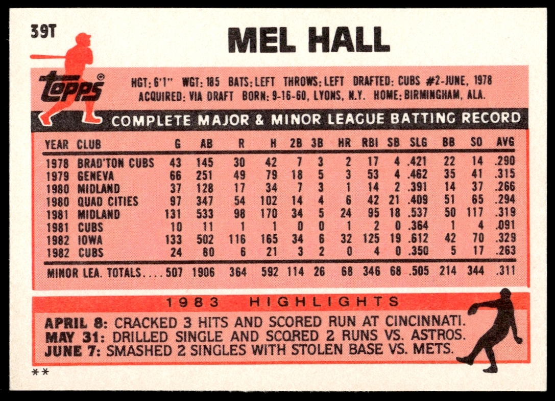 This Baseball card, from 1983 is part of the Topps Traded card set. Mel Hall is featured and has a card number of 39T.