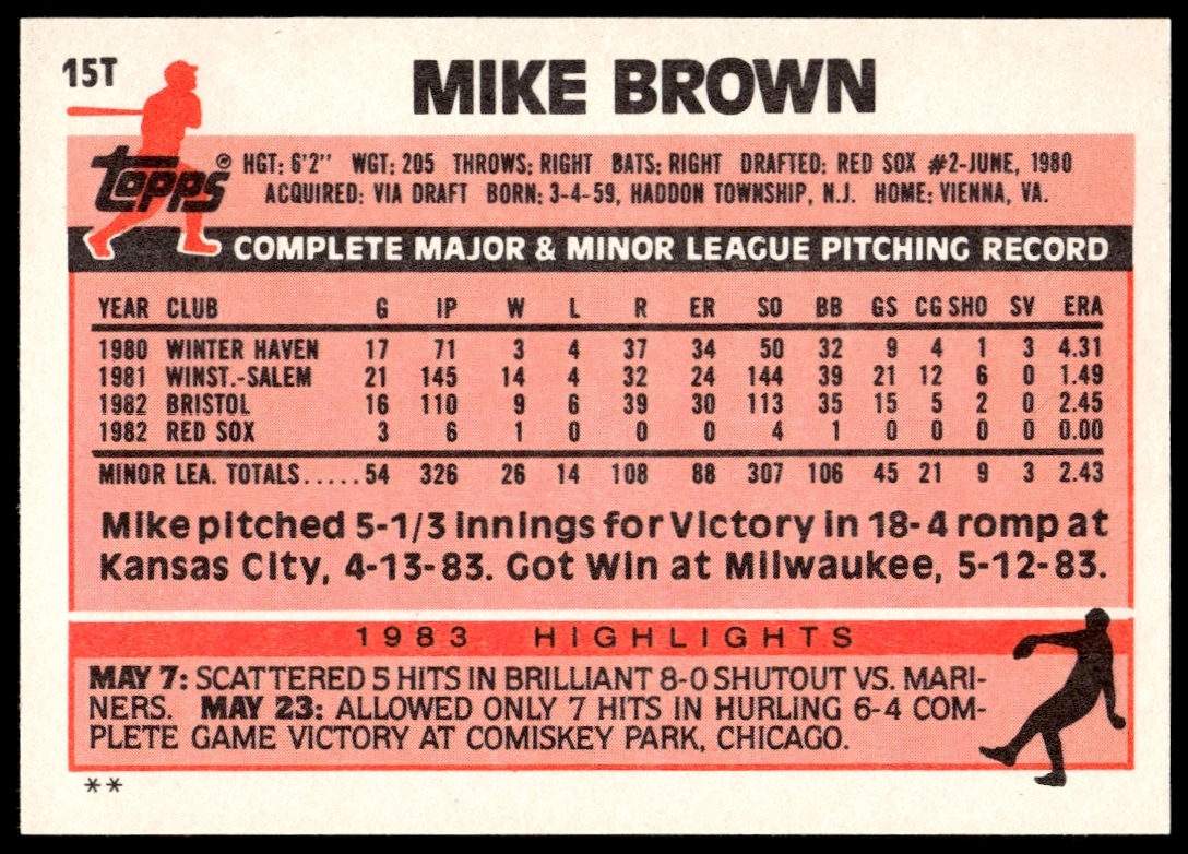 This BaseballΒ card, from 1983 is part of the Topps TradedΒ card set. Mike Brown is featured and has a card number of 15T.