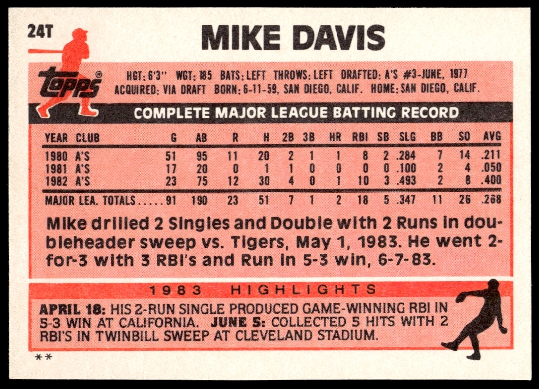 This Baseball card, from 1983 is part of the Topps Traded card set. Mike Davis is featured and has a card number of 24T.