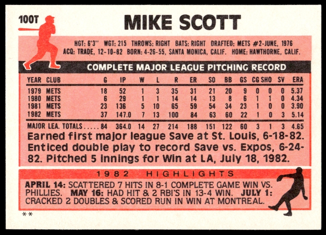 This Baseball card, from 1983 is part of the Topps Traded card set. Mike Scott is featured and has a card number of 100T.