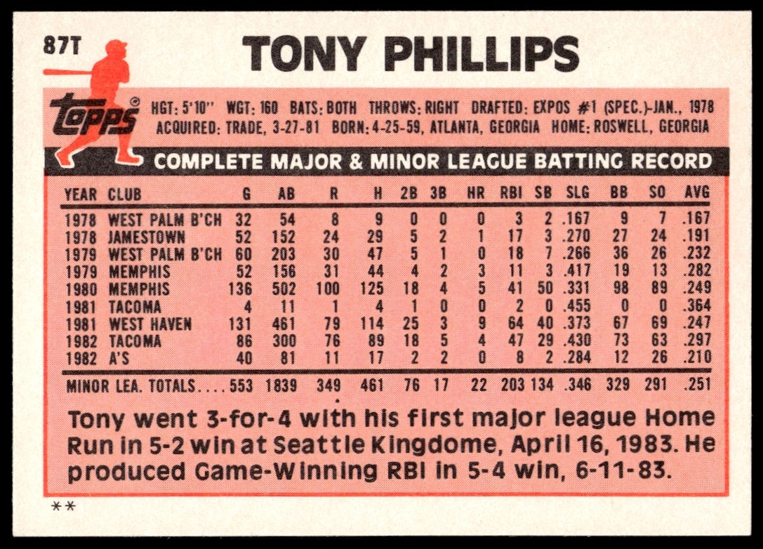 This BaseballΒ card, from 1983 is part of the Topps TradedΒ card set. Tony Phillips is featured and has a card number of 87T.