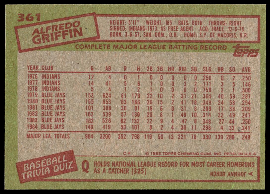 This Baseball card, from 1985 is part of the Topps  card set. Alfredo Griffin is featured and has a card number of 361.