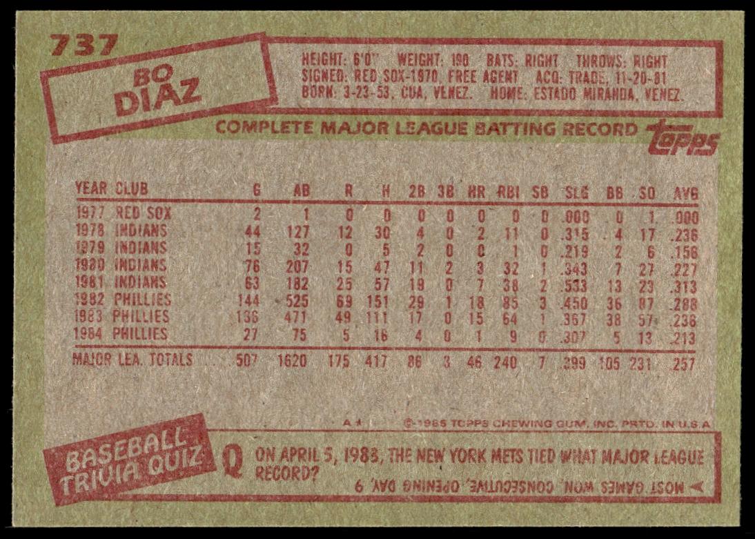 This Baseball card, from 1985 is part of the Topps  card set. Bo Diaz is featured and has a card number of 737.