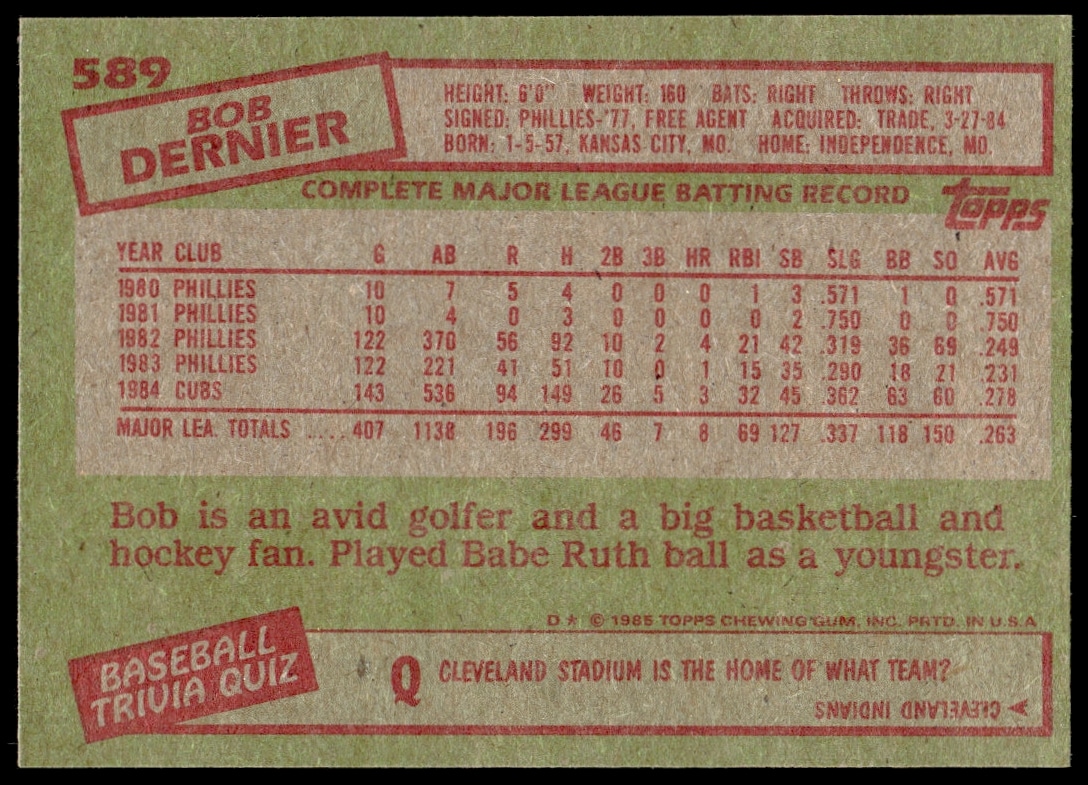 This Baseball card, from 1985 is part of the Topps  card set. Bob Dernier is featured and has a card number of 589.