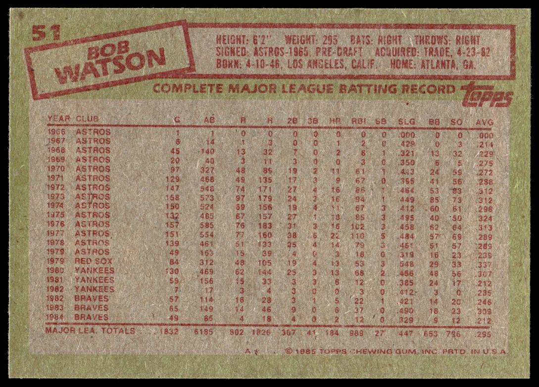 This Baseball card, from 1985 is part of the Topps  card set. Bob Watson is featured and has a card number of 51.