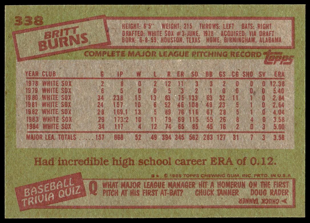 This Baseball card, from 1985 is part of the Topps  card set. Britt Burns is featured and has a card number of 338.