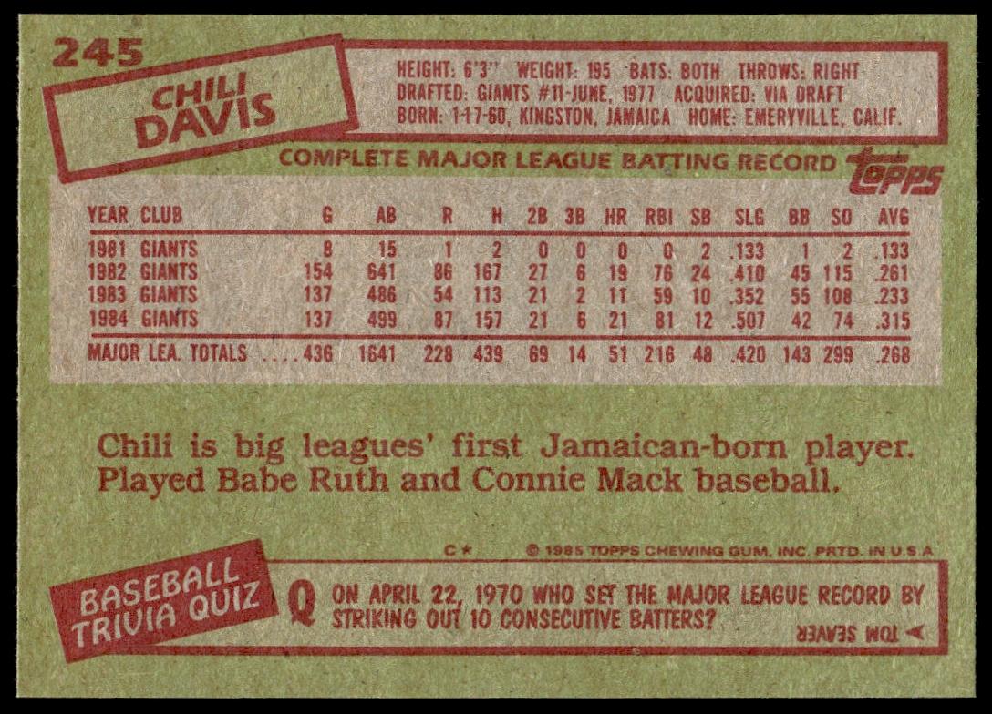 This Baseball card, from 1985 is part of the Topps  card set. Chili Davis is featured and has a card number of 245.