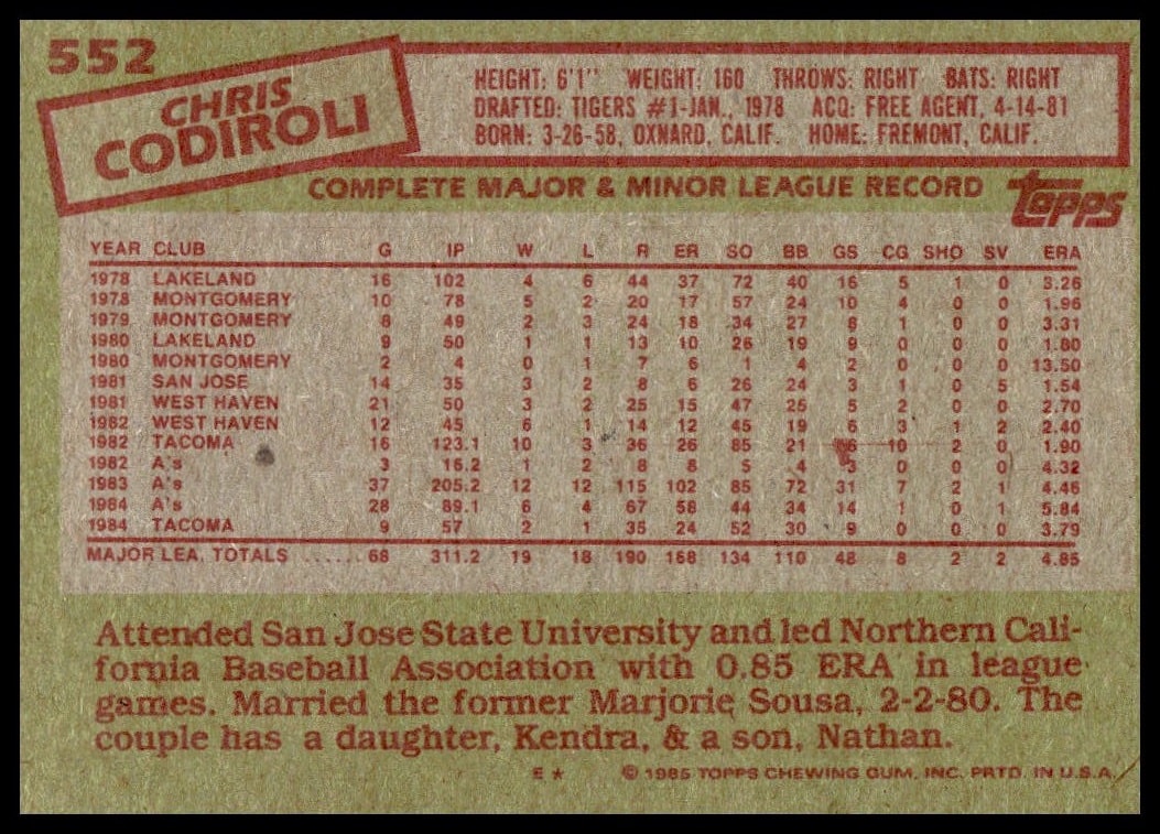 This Baseball card, from 1985 is part of the Topps  card set. Chris Codiroli is featured and has a card number of 552.