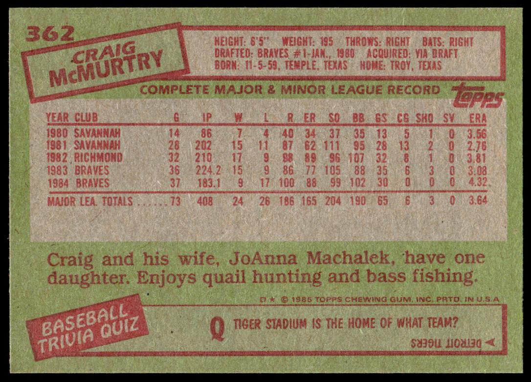 This Baseball card, from 1985 is part of the Topps  card set. Craig McMurtry is featured and has a card number of 362.