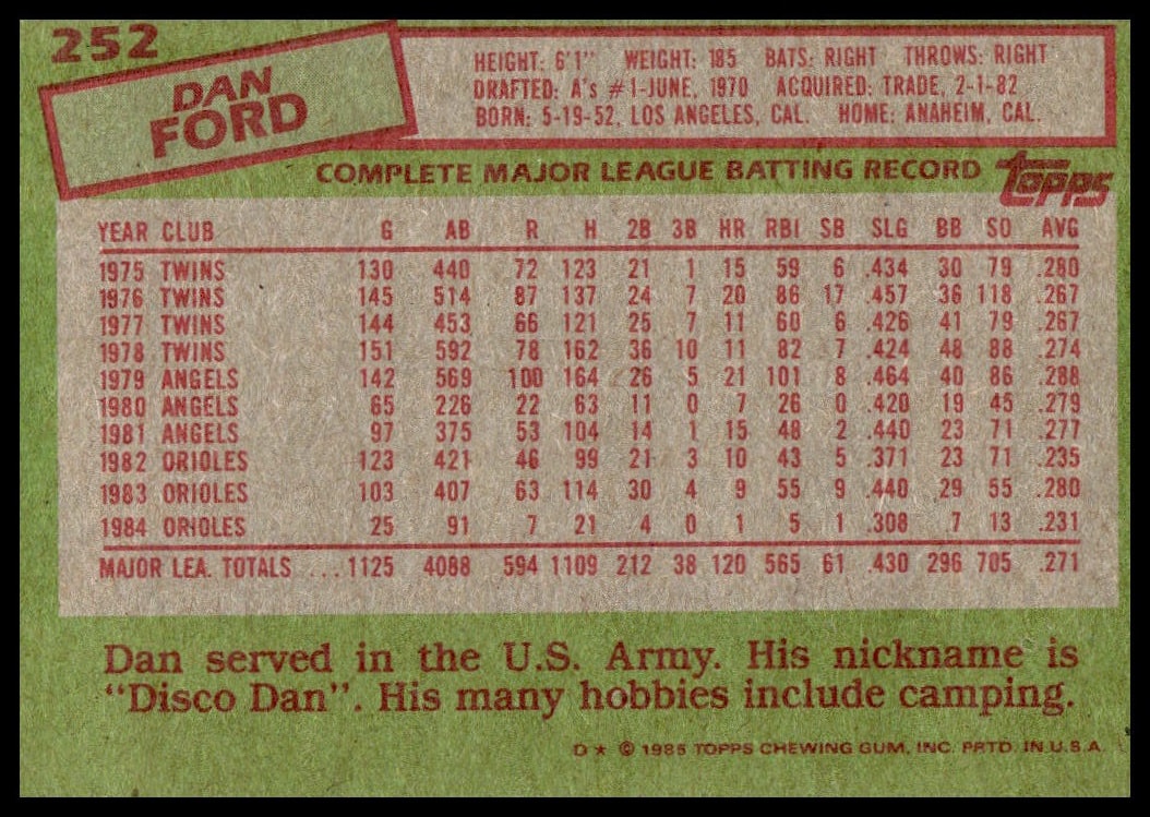 This Baseball card, from 1985 is part of the Topps  card set. Dan Ford is featured and has a card number of 252.
