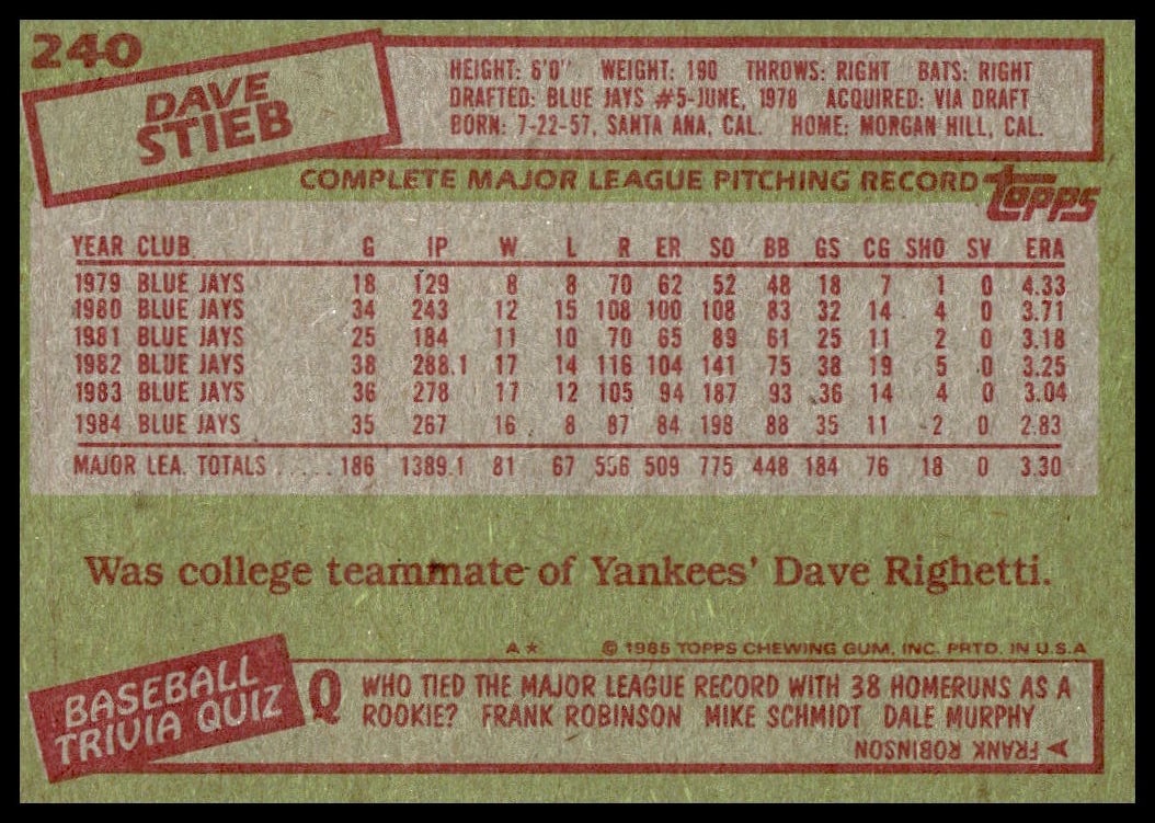 This Baseball card, from 1985 is part of the Topps  card set. Dave Stieb is featured and has a card number of 240.