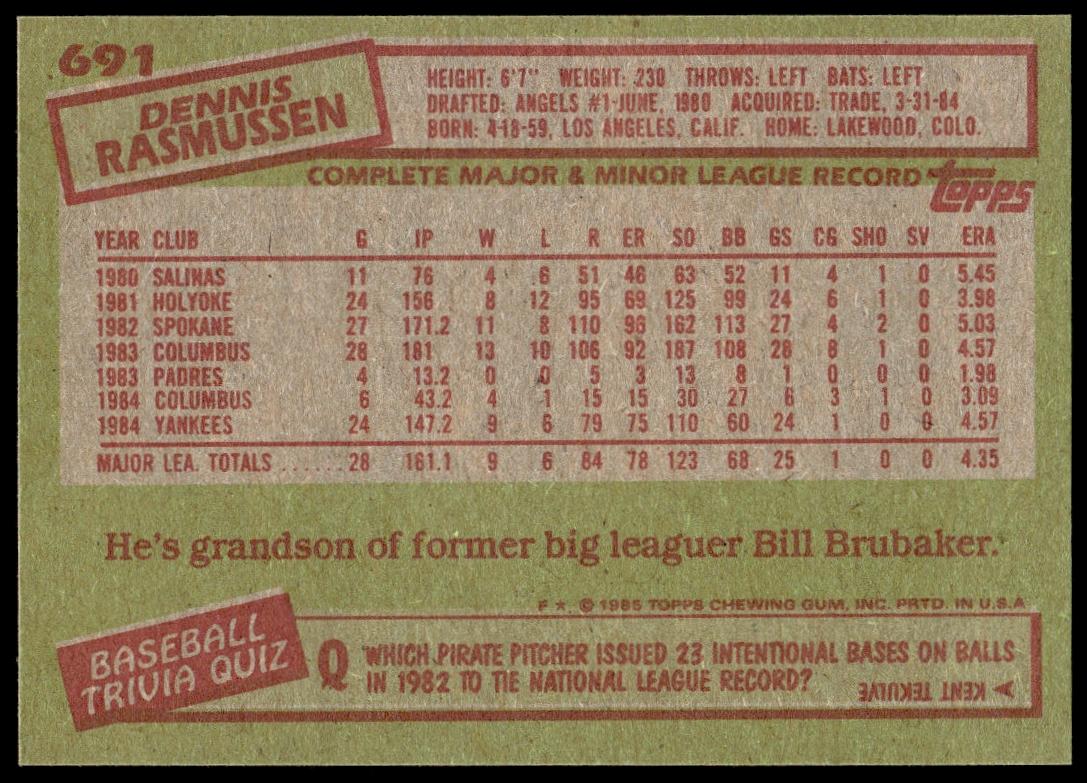 This Baseball card, from 1985 is part of the Topps  card set. Dennis Rasmussen is featured and has a card number of 691.