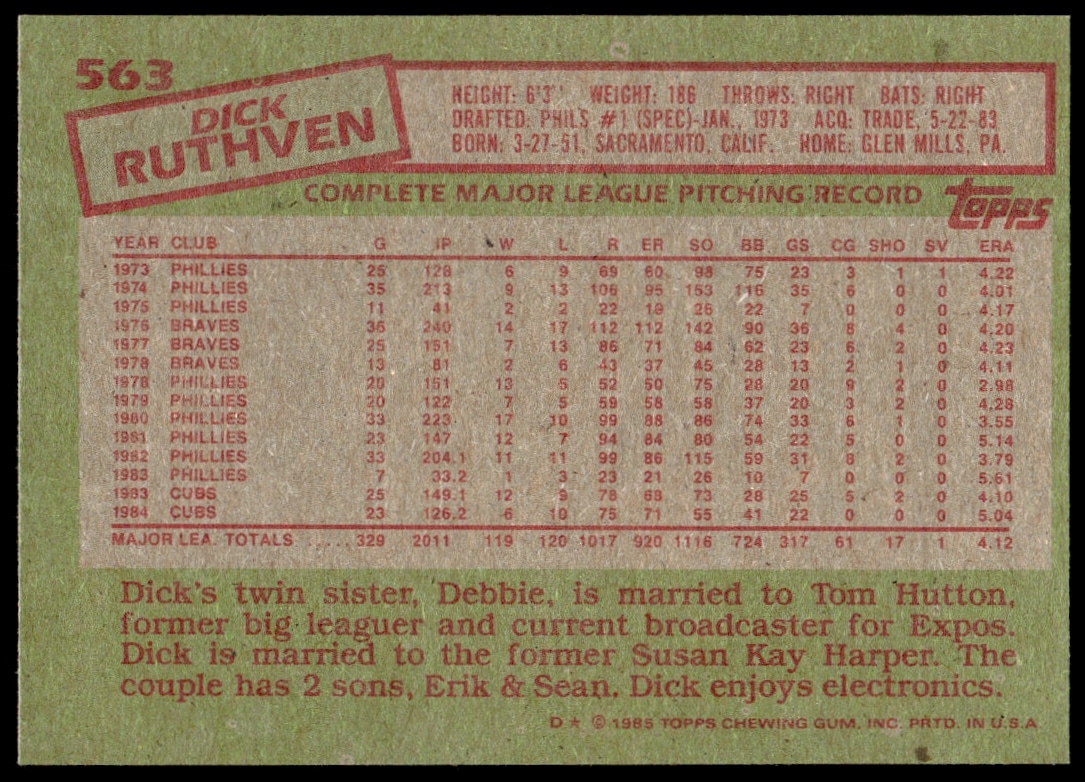 This Baseball card, from 1985 is part of the Topps  card set. Dick Ruthven is featured and has a card number of 563.