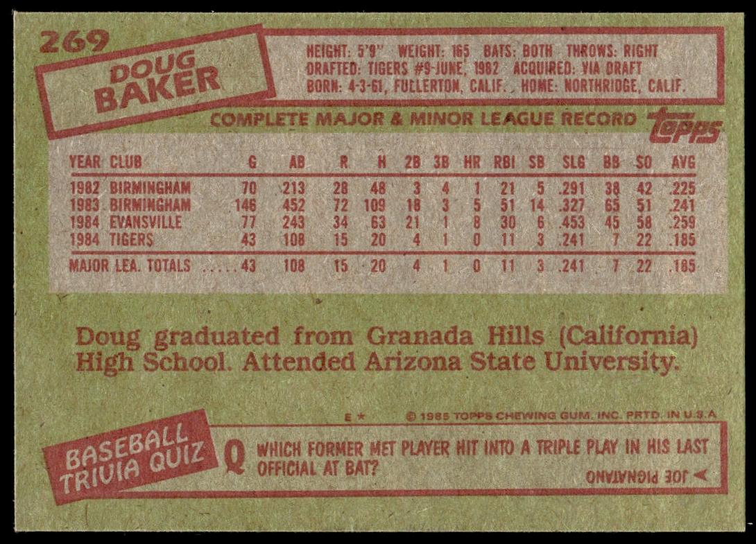 This Baseball card, from 1985 is part of the Topps  card set. Doug Baker is featured and has a card number of 269.