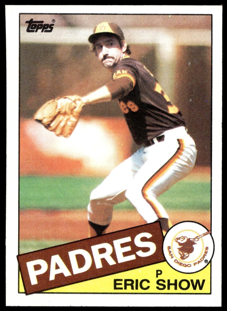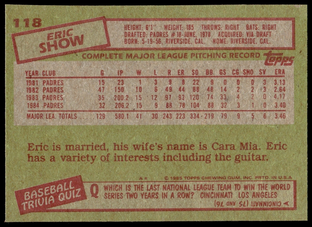 This Baseball card, from 1985 is part of the Topps card set. Eric Show is featured and has a card number of 118.
