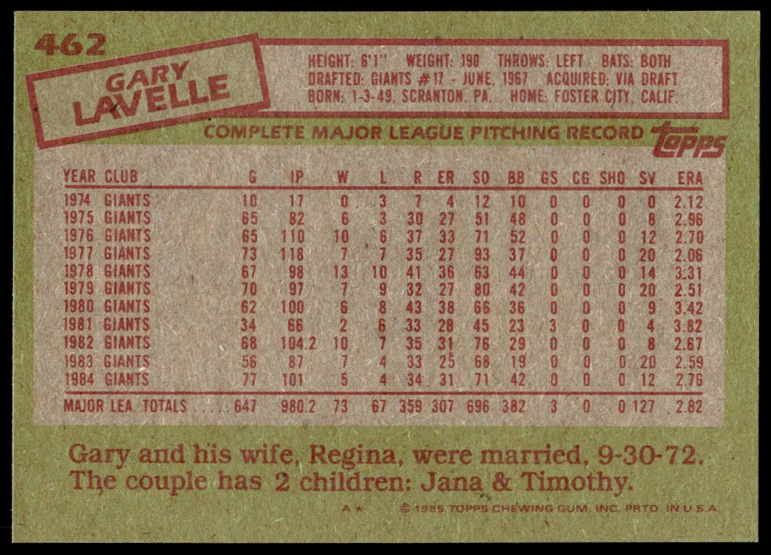This Baseball card, from 1985 is part of the Topps  card set. Gary Lavelle is featured and has a card number of 462.