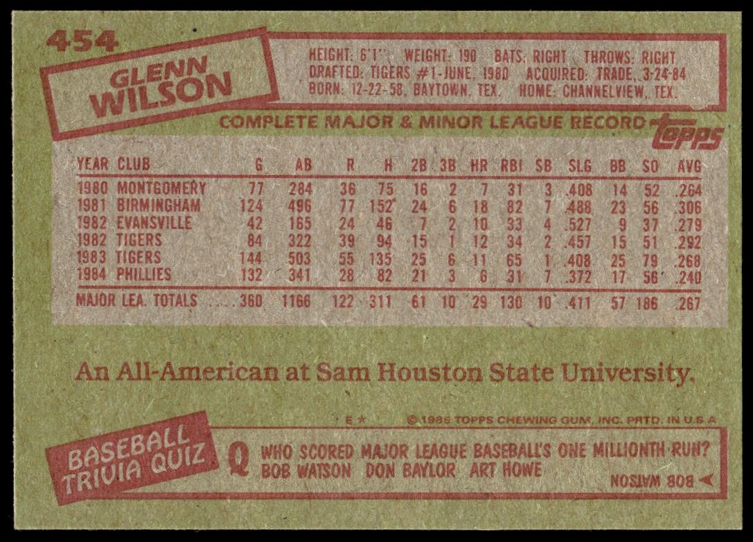 This Baseball card, from 1985 is part of the Topps  card set. Glenn Wilson is featured and has a card number of 454.