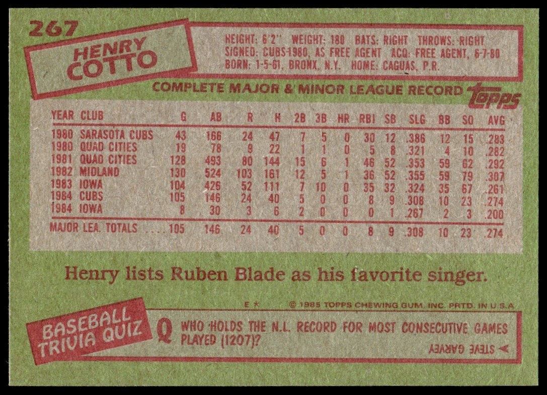 This Baseball card, from 1985 is part of the Topps  card set. Henry Cotto is featured and has a card number of 267.
