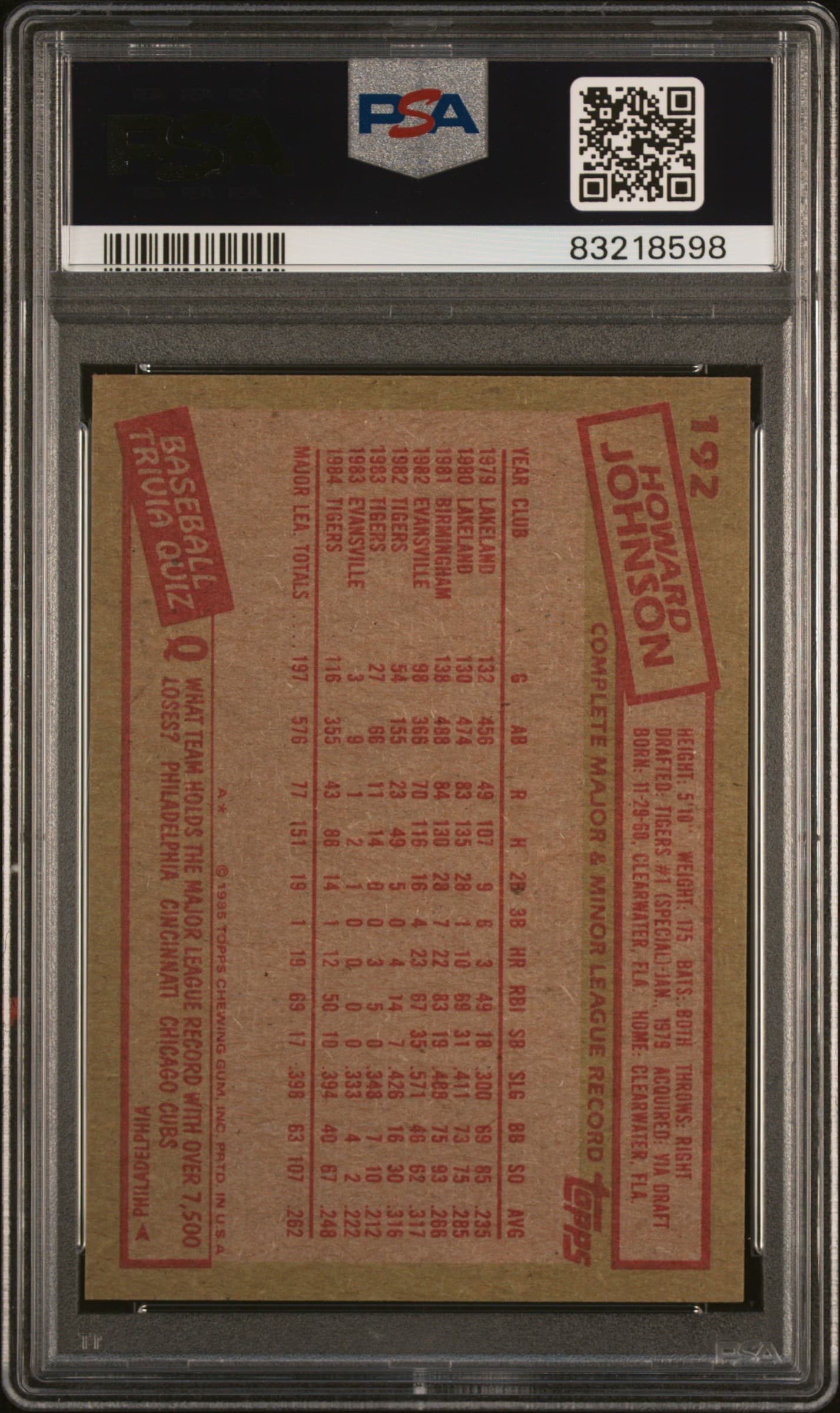 1985 Topps Howard Johnson #192 features an error with registration dots, graded PSA 8. A must-have for collectors!